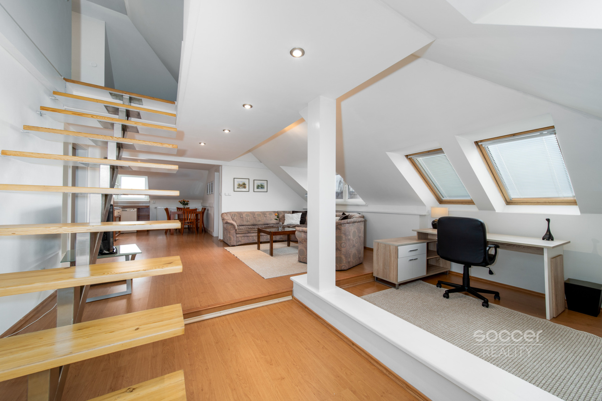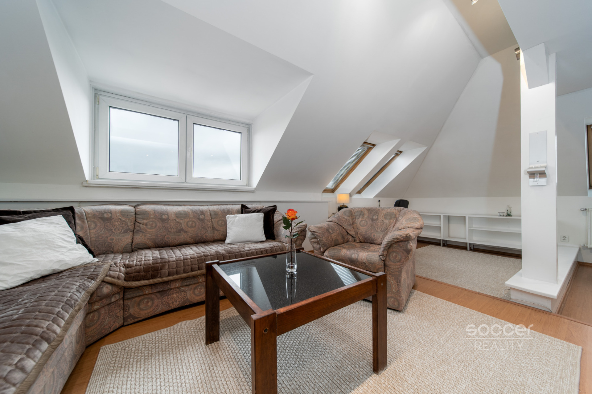 Vzdušný a velmi příjemný interiér je plně vybaven vkusným nábytkem i spotřebiči. K dispozici je velký obývací pokoj s pracovním koutem, kuchyňský kout s jídelnou, samostatná ložnice, obytná místnost v podkroví, koupelna s vanou i sprchou, toaleta a vstupní chodba s vestavěnou skříní. Dřevěné prvky krásně podtrhují originalitu místa. Parkování je v ulici i okolí bezplatné.